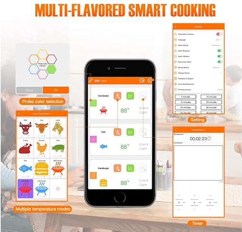 • Smartphone App Integration: Real-time temperature updates and cooking alerts