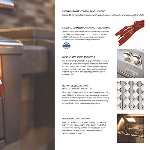 The Alfresco grill is a showstopper when it comes to outdoor cooking. Its heavy-duty stainless steel construction not only ensures durability but also contributes to a sleek aesthetic look that complements any outdoor setting. The inclusion of a Premium Accufire titanium and stainless steel burner system means it delivers outstanding heat distribution, perfect for achieving those coveted professional-quality sear marks.