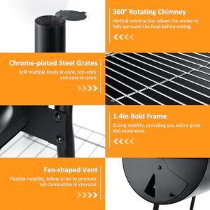 The barrel charcoal grill boasts a robust construction made from 0.7mm cold-rolled plate, coated with a high-temperature powder finish on both sides. Supported by a sturdy 1.4-inch thick bracket, this grill remains smooth and steady, even during intense cooking sessions. Its portability is enhanced with built-in wheels, making it easy to move around your yard.