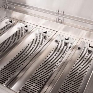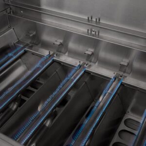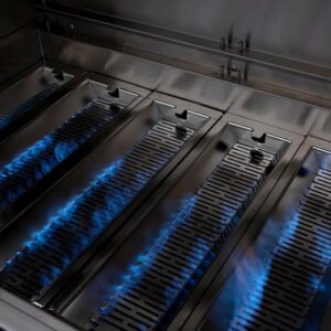 The integration of ceramic briquettes is a game changer, sitting strategically above the burners to offer radiant heat that effectively eliminates hot and cold zones.