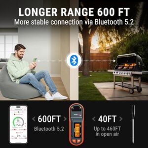 - 600 ft Wireless Range: Monitor your cooking from up to 600 feet away, perfect for large grills or outdoor setups.