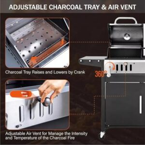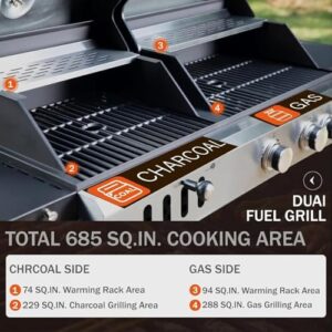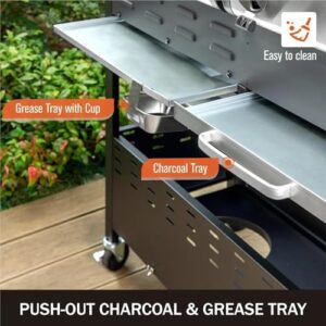 The grill is split between a charcoal side and a gas side, offering a combined 685 sq.in. of cooking space. For the charcoal enthusiast, you’ll find a 229 sq.in. grilling area accompanied by a 74 sq.in. warming rack. The gas side features a 288 sq.in. grilling area with an additional 94 sq.in. warming rack. This dual capability allows you to enjoy the traditional charcoal flavor while also having the convenience and quick-start functionality of a gas grill. The push-out charcoal tray and grease tray with cup make it extremely easy to clean after use.
