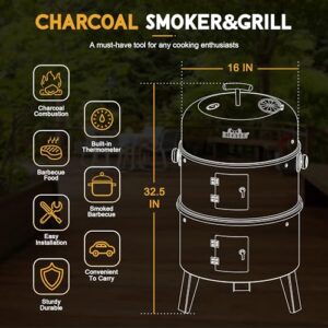 In summary, the BIG HORN OUTDOORS 16 inch Charcoal Smoker redefines your outdoor cooking experience with its multifunctional design, superior quality, and innovative portability. Whether you’re a seasoned pitmaster or a weekend griller, this versatile smoker is built to meet all your grilling and smoking needs. Its ease of use, spacious cooking area, and robust build make it a valuable addition to any outdoor cooking setup.