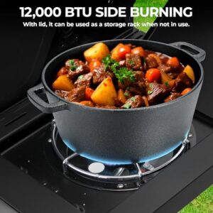 This grill offers plenty of cooking space with a 414 sq.in cast iron main cooking area, a 91 sq.in enameled auxiliary cooking area, and a 260 sq.in preparation area. The large cooking area is perfect for grilling multiple items simultaneously, making it ideal for large gatherings. The double-layer stainless steel magnetic cabinet door provides ample storage space for your propane tank, grilling tools, and other accessories. This makes your barbecue experience more efficient and organized.